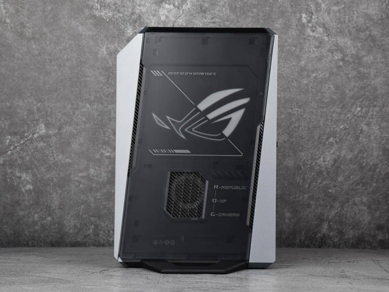 这款产品的整体外观设计风格极具ROG家族的风格,侧面看过去,前后两端采用了金属银色面板打造,右侧面配置了一块磨砂半透明面板,上方是ROG标志性的LOGO,下方正对风扇的区域开有进风口,进风口右侧印有ROG所对应的英文全称。